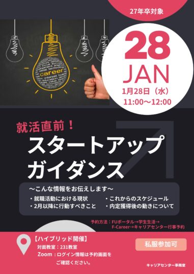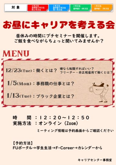 面接は、就職活動を行う上で避けては通れない重要ポイントです。実際の面接に自信を持って臨むにはどうすればよいのか、集団面接での効果的な自己PRの方法やポイントを説明します。積極的に参加して就職活動に備えましょう。実施日:3月24日(火)・25...
