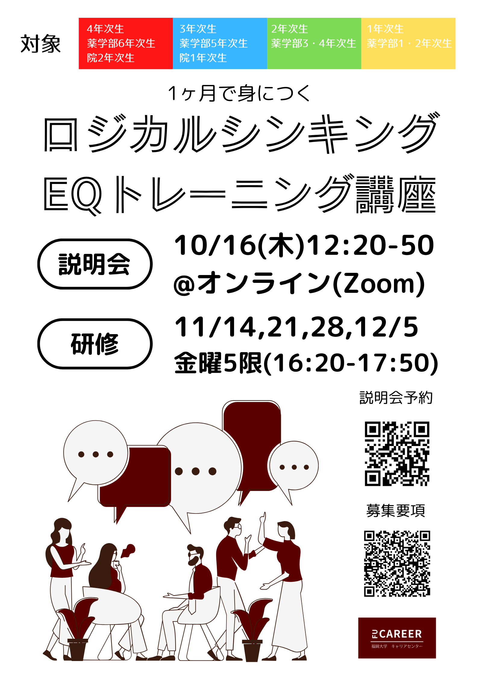 F-Career→「キャリアセンター行事予約」→「【応募フォーム】ロジカルシンキング・EQトレーニング講座」からお申し込みください。