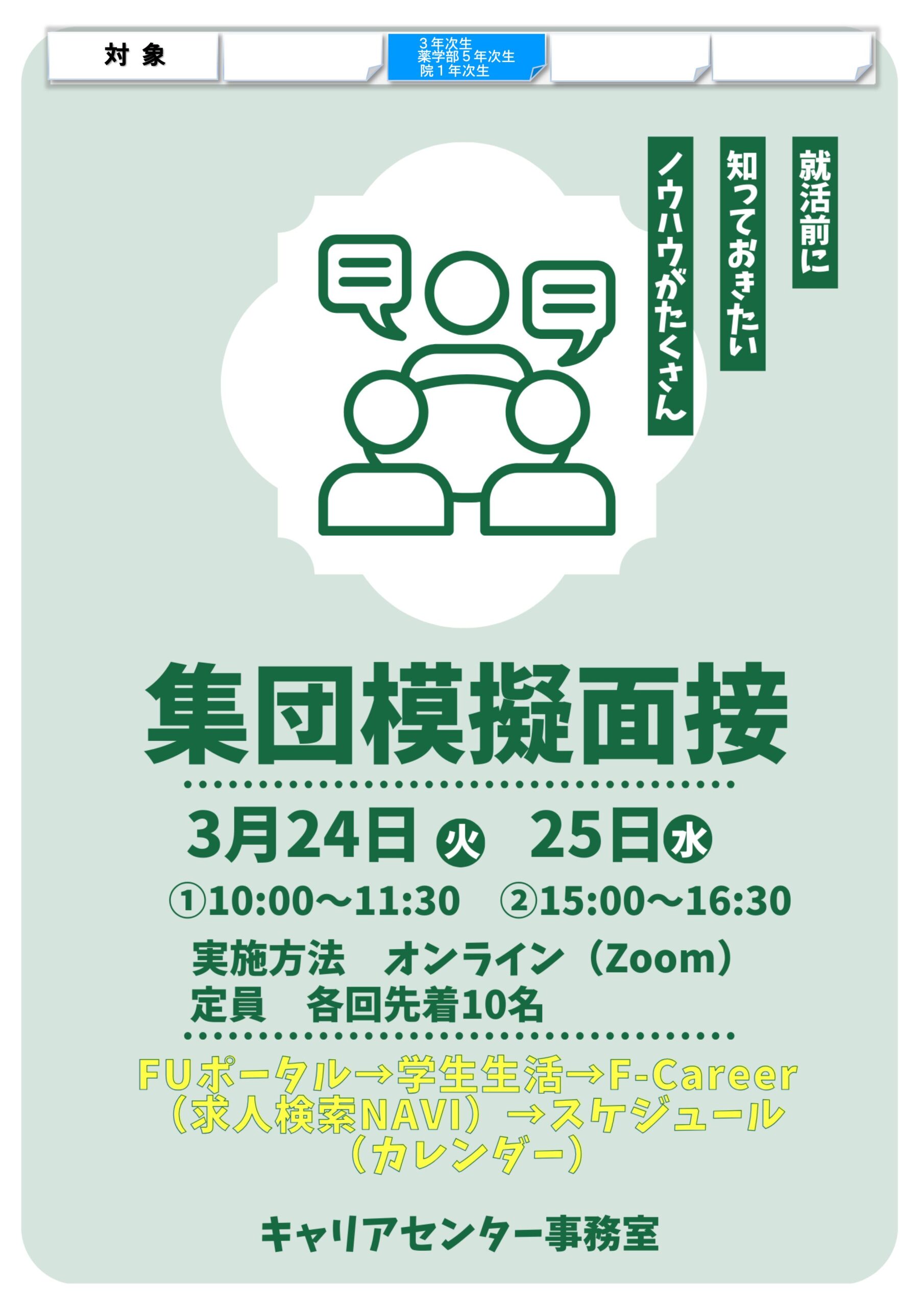 申込方法:FUポータル→学生生活→F-Career(旧求人検索NAVI)→行事カレンダー から予約
