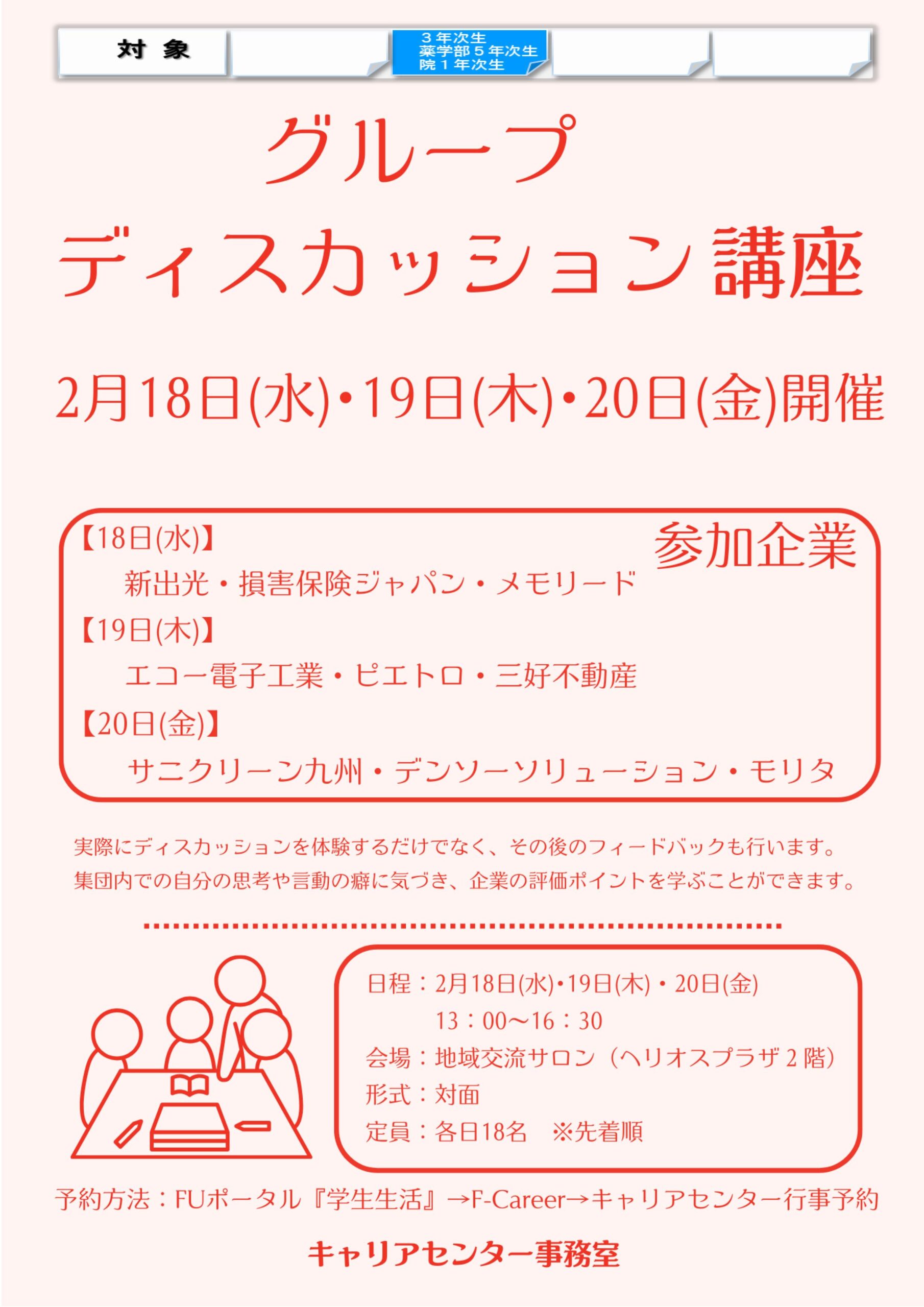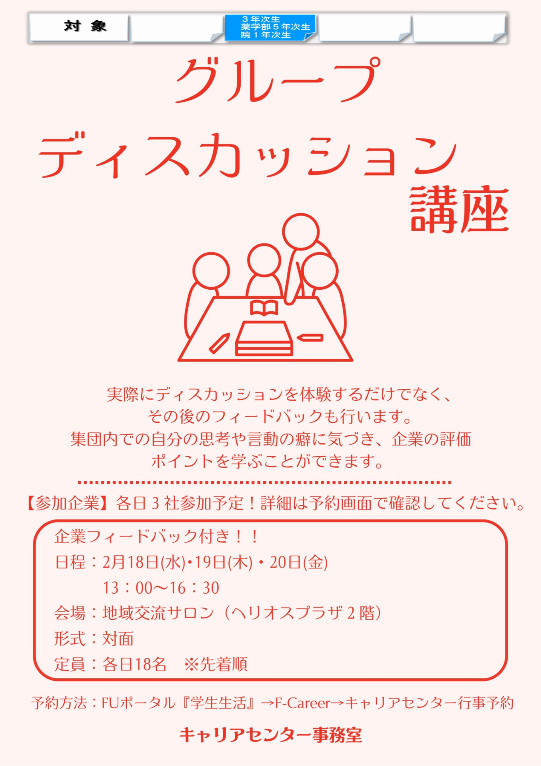 予約方法:FUポータル→学生生活→F-Career→キャリアセンター行事予約から実施日前日の16時までにご予約ください。