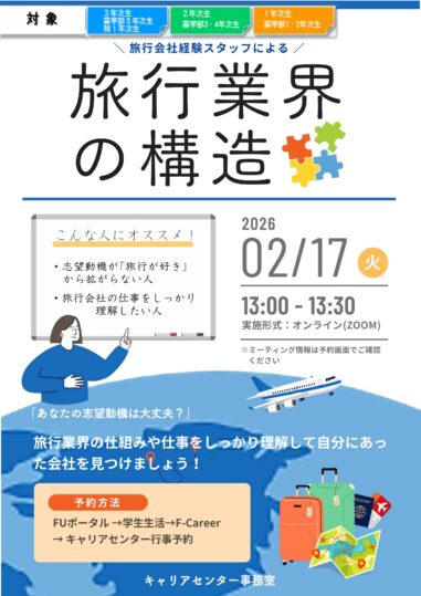 イベント 「旅行業界の構造」セミナーについて(お知らせ) 学生の皆さんへ先日の合同説明会で旅行業界に興味を持った方も多いと思います。しかし、一言に「旅行会社」と言っても、そのビジネスの形は多種多様です。旅行会社は、「登録種別」や、役割の違いにより、関わる仕事の領域が異なります。• いわゆる「総合旅... 2026.02.03 イベント全体