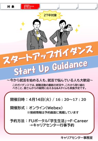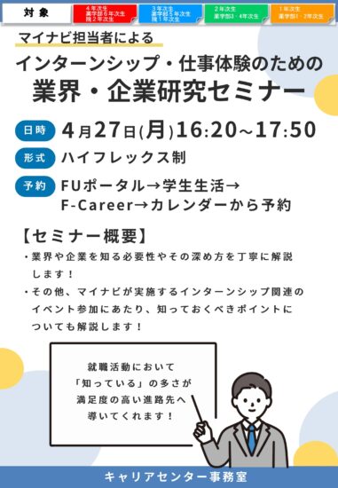 5月16日(土)に「学内OB・OG交流会」を開催します。卒業生から直接、仕事のやりがいや本音を聞くことは、皆さんにとって貴重な経験になります。「働くとは?」「どんな企業があるの?」「就職活動って?」というギモンを先輩と一緒に話していきましょ...