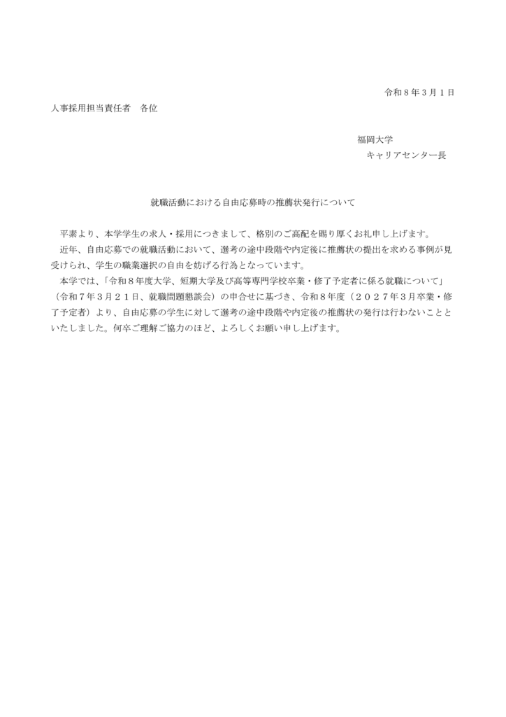 就職活動における自由応募時の推薦書発行について、本学として下記文書の通り定め、自由応募の学生に対して、推薦状の発行は行わないこといたしました。何卒ご理解のほどよろしくお願い申し上げます。